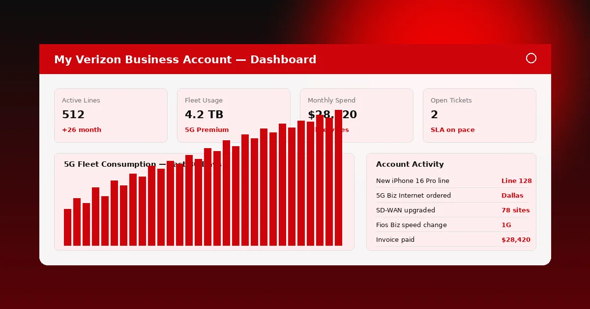 Verizon Business commercial account dashboard with active wireless lines, monthly spend and pending service tickets in red and black theme